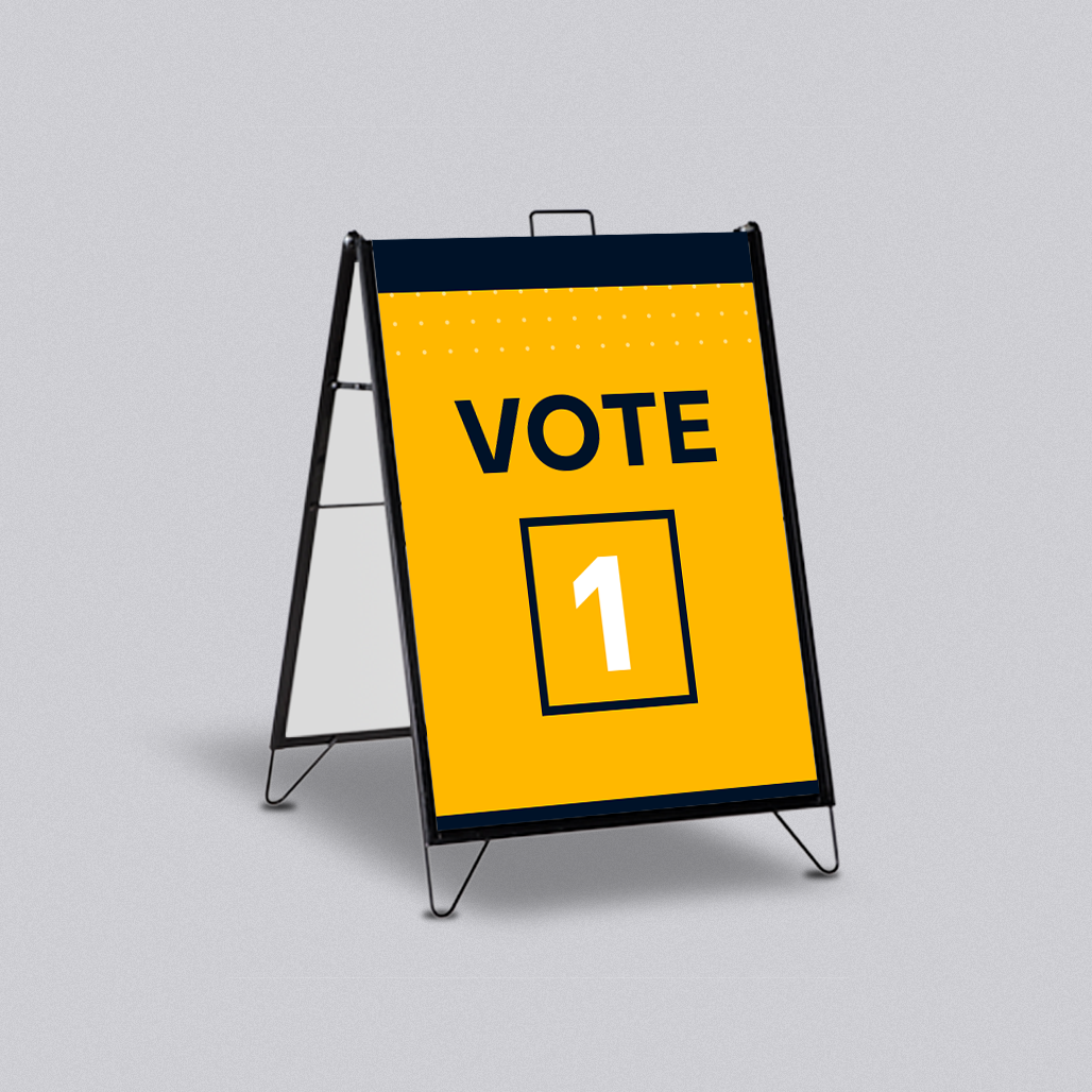 A classic A-Frame can be set up almost anywhere, which makes it a great tool for election candidates. It s budget-friendly, super quick to set up and allows anyone to claim a space and broadcast messages with minimum fuss. With 3mm Corflute included as standard, it's the perfect lightweight indoor display, or add tent pegs to the feet to turn this into a sturdy outdoor advertising tool.
