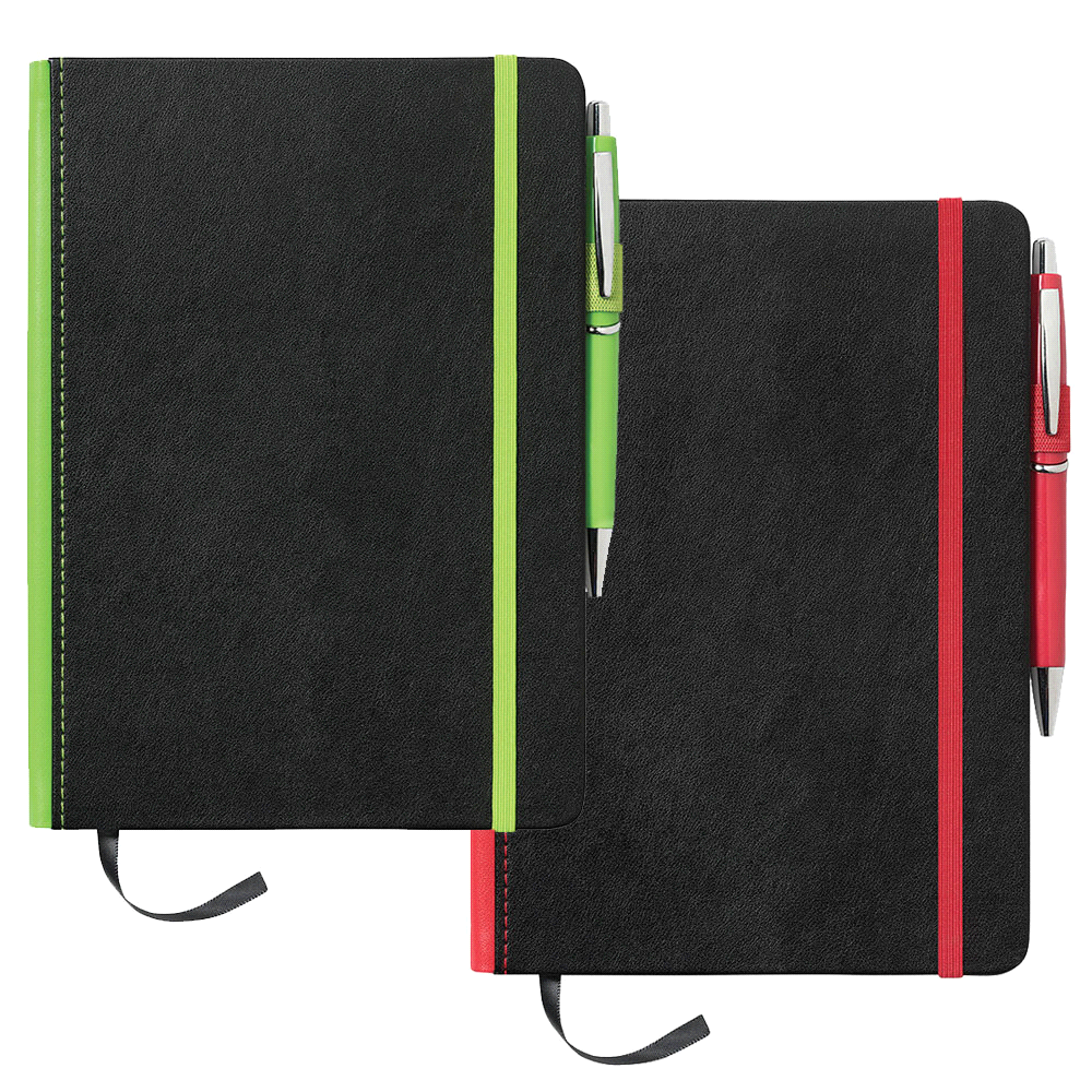 Trimmed with some colour down the spine this notebook has a built-in elastic closure, ribbon marker, pen loop & document pocket on inside back cover. Pen not included. Lined white paper.