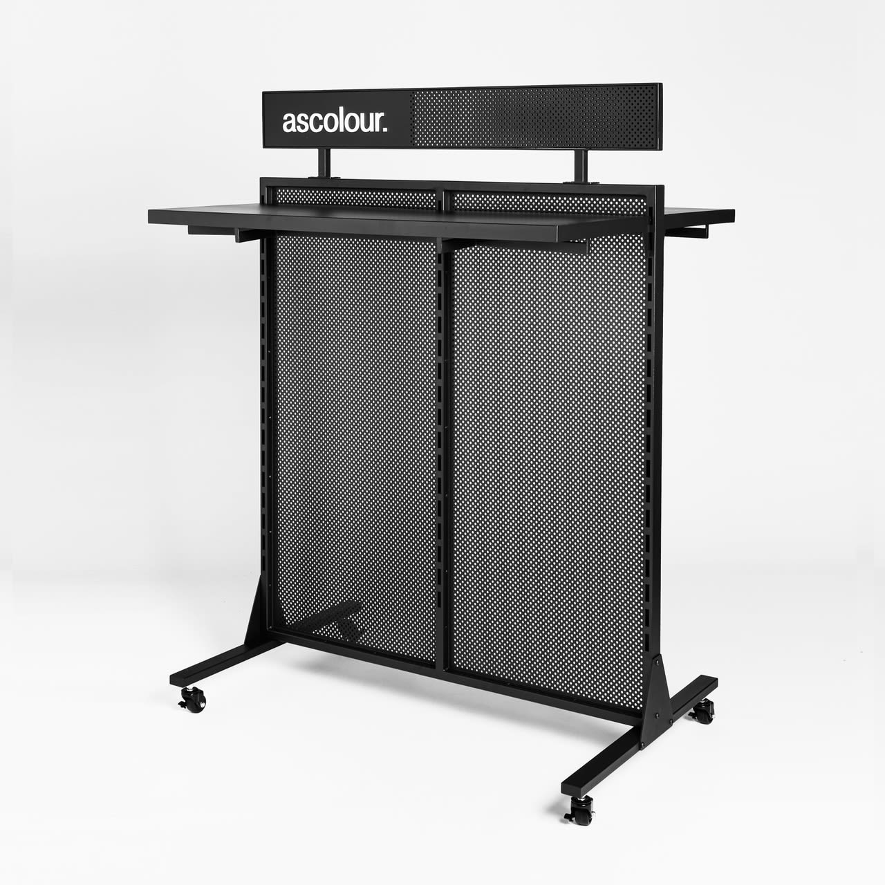 ASC branded steel modular racking system for merchandising your showroom. Double-sided with removable shelf and hang rail. Dimensions (mm): H 1661 W 1225 D 920