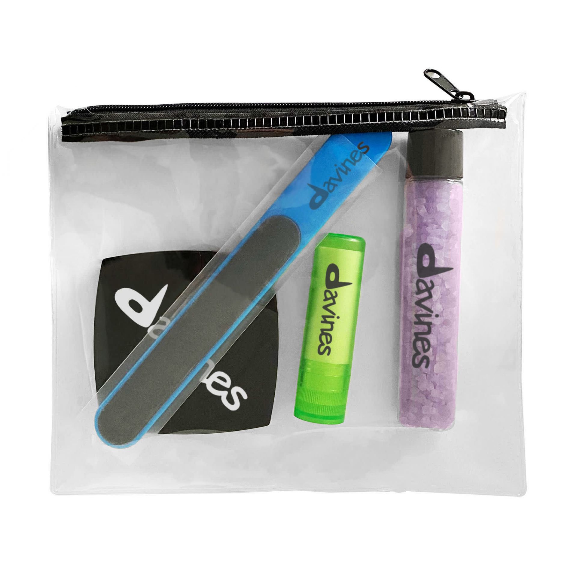 This beauty bundle contains (CG003) Remo company mirror, (NF002) Paris nail file, (LPB002) lip balm stick, and (BS001) bath salt tube, all packed into a (PKG013) Isuki pencil case. Pick and choose your own colour combinations.