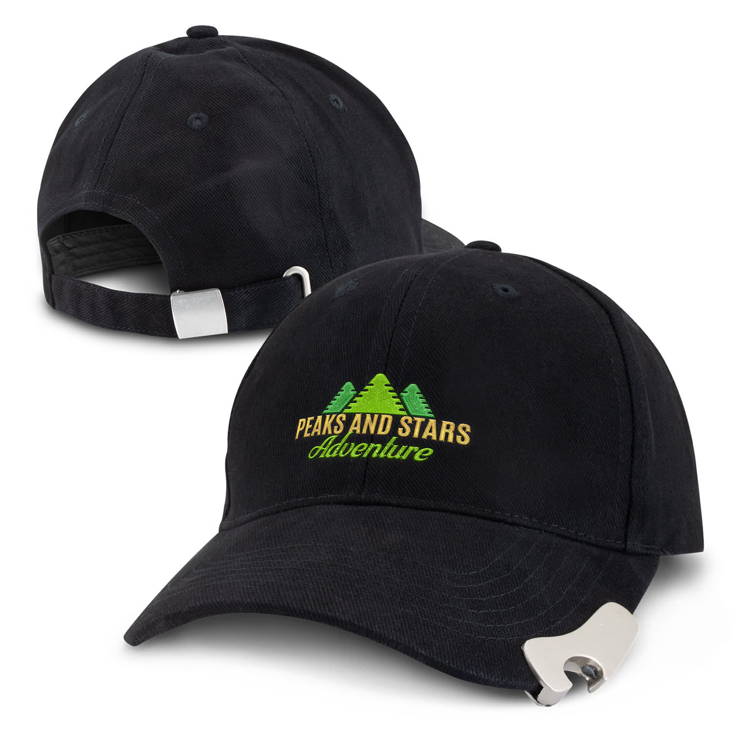 Premium structured six panel cap which is made from 100% cotton with a convenient stainless steel bottle opener on the peak. It features embroidered eyelets, a pre-curved peak, a sweatband and an adjustable closure with a smart metal buckle which allows one size to fit most people. Features: * Premium cotton 6-panel cap * Pre-curved peak with bottle opener * One size fits most * Embroidered eyelets and a sweatband * Adjustable closure with a smart metal buckle