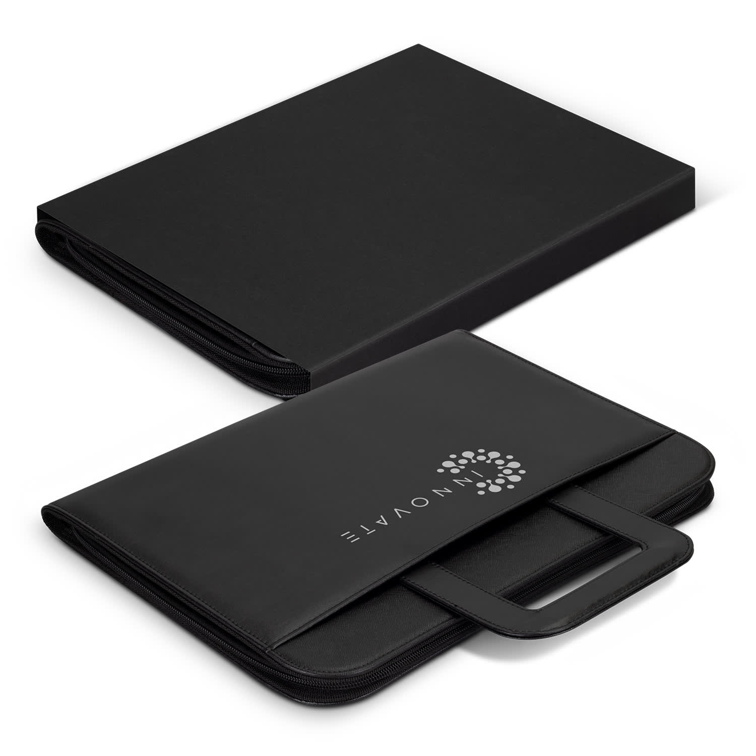 Travel-inspired portfolio case made of PU with foldaway handles. It has a zipped closure as well as two external and three internal document slips. Internal pen loops, a passport/ticket holder, a tablet slip pocket, and six business card holders are also included in the portfolio. Features: * PU portfolio with foldaway away handles and zippered closure * Internal pen loops, passport/ticket holder, tablet slip pocket and six business card holders * Two external and three internal document slips