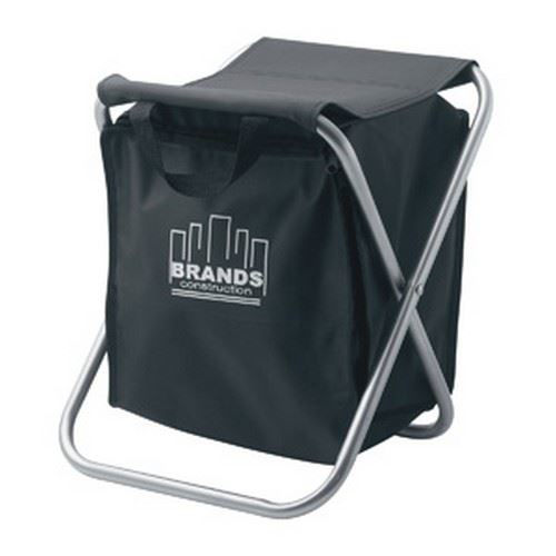 Silver metal frame stool, cooler bag 300 H x 300 W x 220mm D in black heavy duty nylon with carry handles.In polybag.