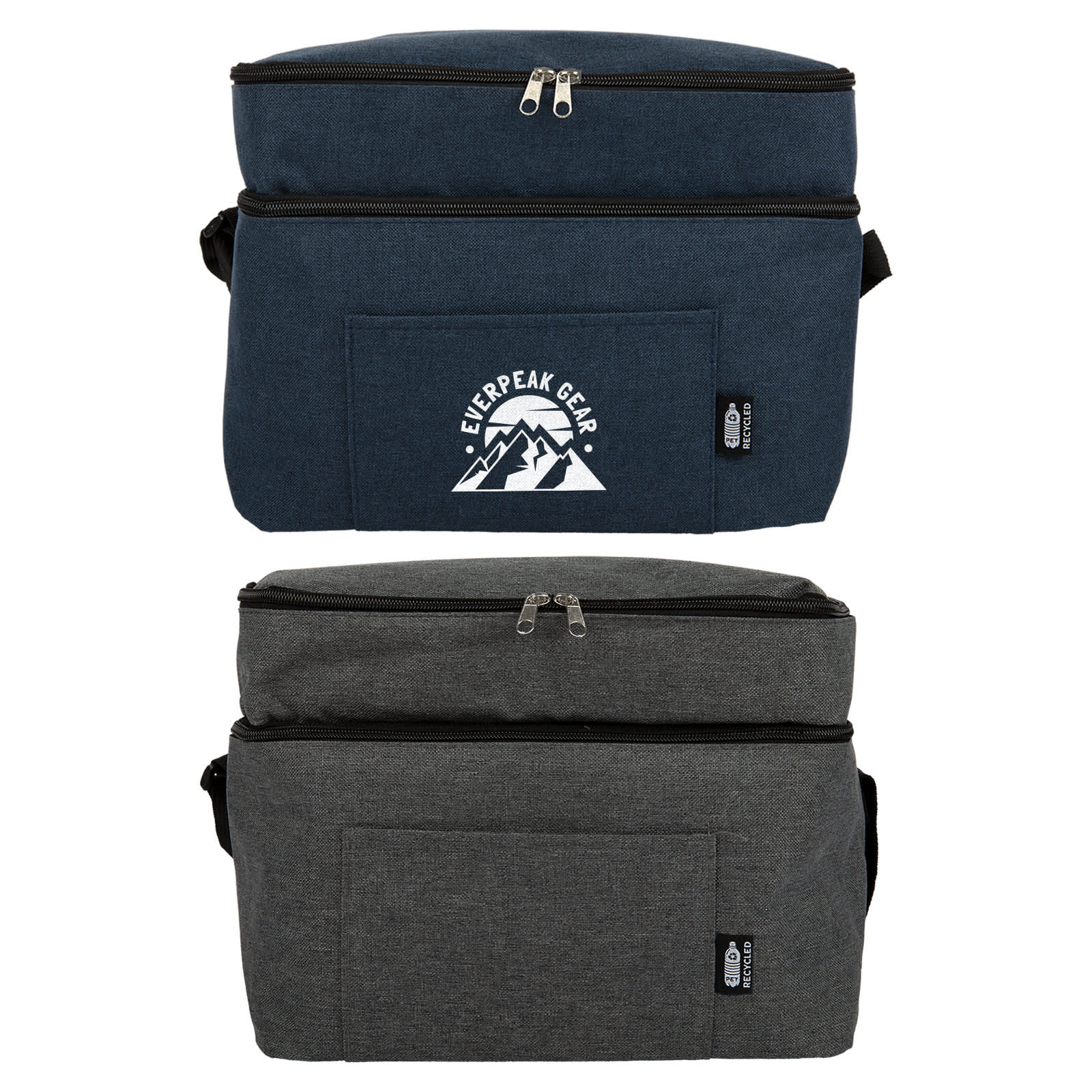 Discover the Duo RPET 2 Compartment Cooler Bag, a practical and eco-conscious solution for keeping your food and beverages cool. Made from RPET polyester 600D with PEVA lining and PE foam, this cooler bag is available in Navy Blue or Grey, offering a stylish and sustainable choice to suit your preference. It features two separate compartments to keep items organized and fresh. The adjustable black polyester web carry strap ensures comfortable transport, while the front pocket (180mm x 110mm) is perfect for storing small items like keys or bottle openers. Measuring approximately 300mm x 210mm x 220mm H and with a 14L capacity, this large cooler bag is ideal for various occasions. It includes an internal care label and an RPET tag on the outside, highlighting its sustainable design. The black zipper closure adds a sleek touch to its functionality.