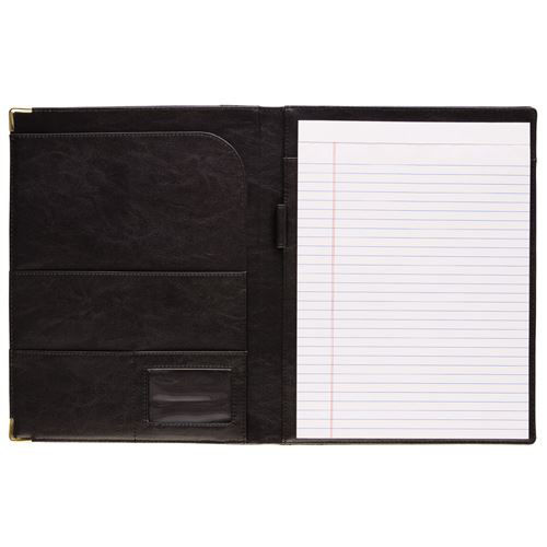 8660.U99 - Tough, durable, stylish and low cost. Sleek and slim non padded black leather-look PU conference pad holder featuring gold corners at front, writing pad, storage for hand outs and loose sheets, pen loop and clear card window pouch.