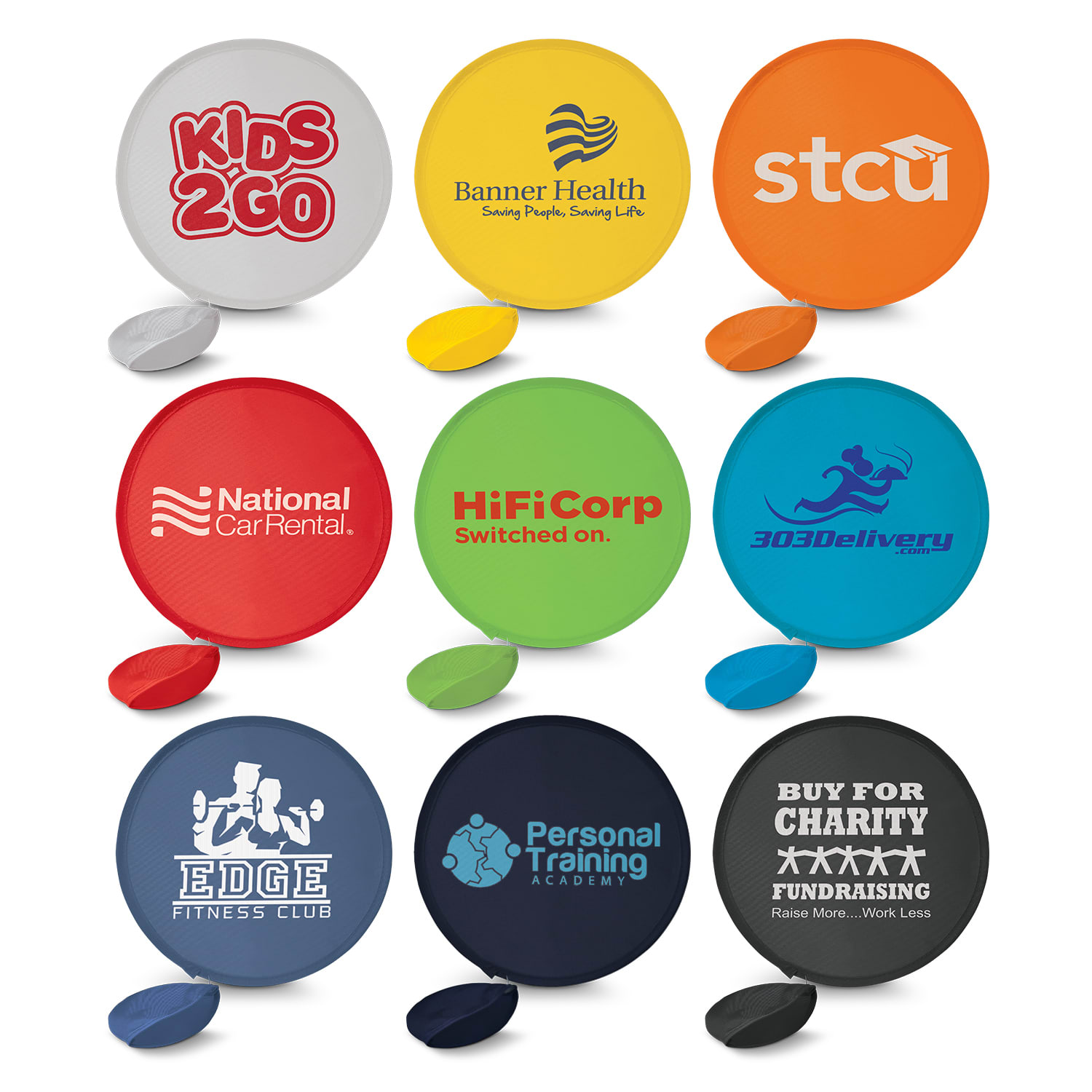 Inexpensive giveaway product which can be used as a fan. It has a high tensile internal wire frame and is supplied flat, ready for use with a handy storage pouch. Features: * Affordable giveaway product which can be used as a fan * High tensile internal wire frame and is supplied flat * Includes a handy storage pouch