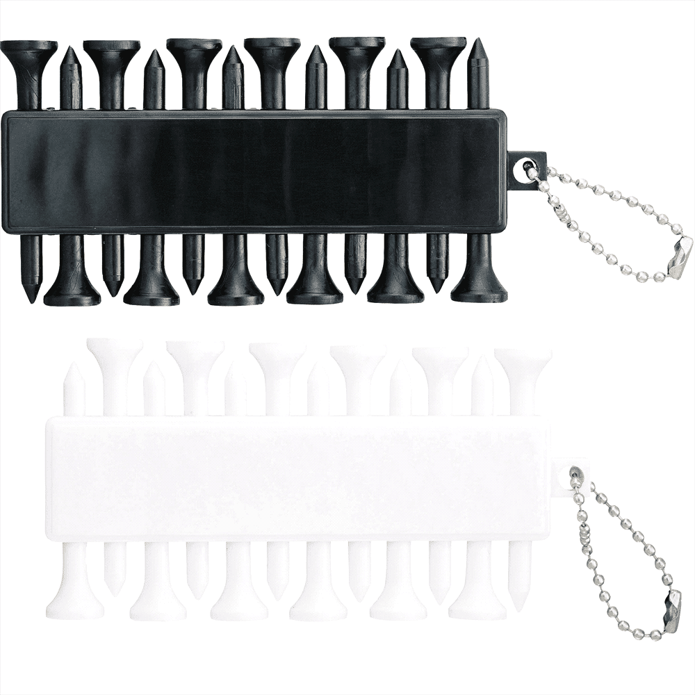 12 golf ball tees and 3 golf ball markers on beaded chain.