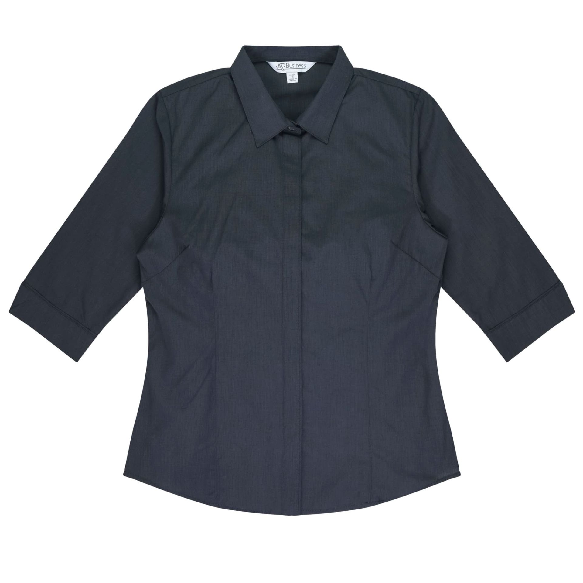 STYLE: 2902T Sizes: 4-26 Fabric: 65% Polyester 35% Cotton Features: Bust and waist darts front and back create a feminine fit There is a “chesterfield” front where the placket conceals buttons as well as a hidden Magic Button. Bias piping has been added to the front placket edge and sleeve cuff seam. The three quarter sleeve has a ‘V’ edge stitched trim. Anti-pilling treatment 3 Colours: Shadow Grey, Mauve, Mid Blue