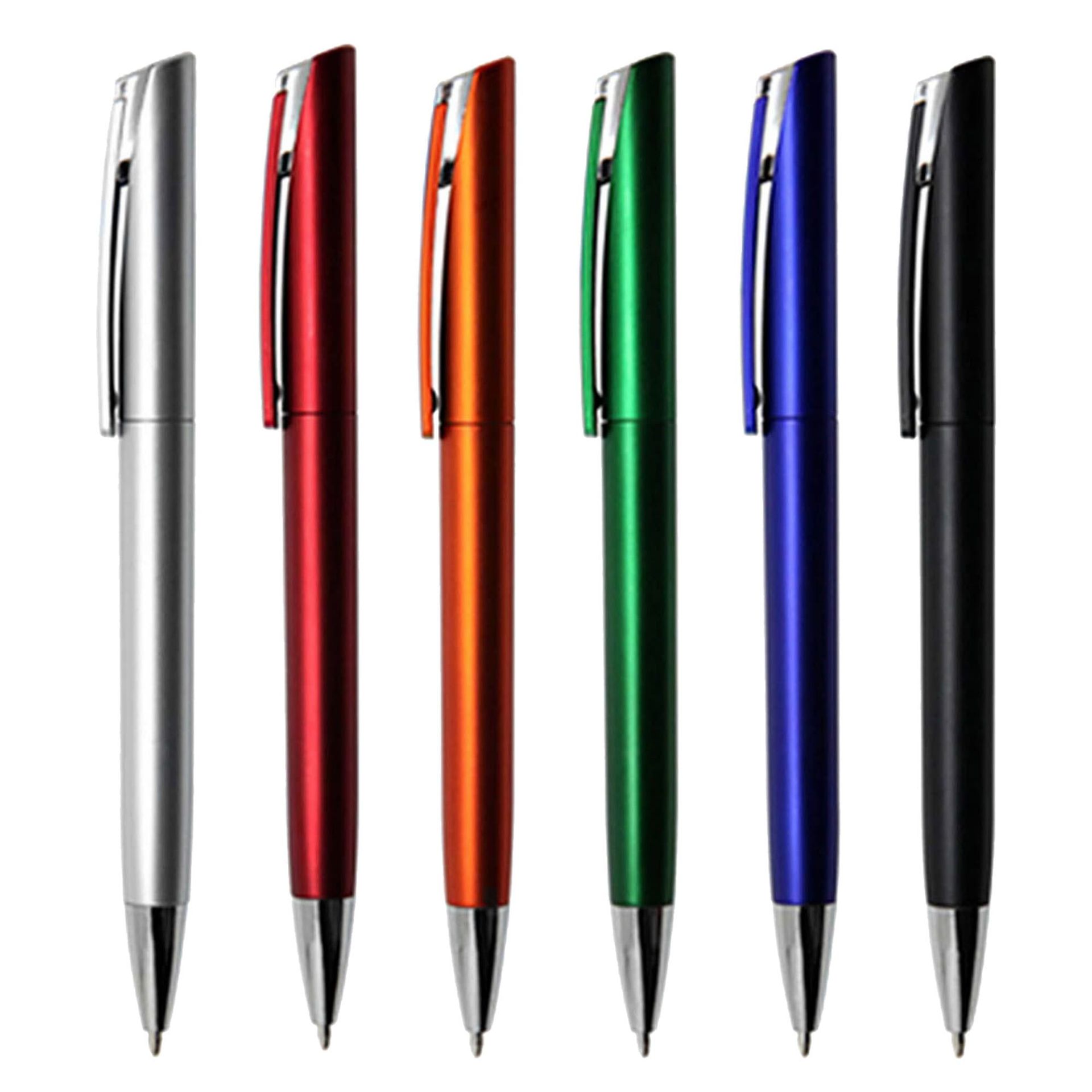 A quality plastic pen designed by European designer twist action with silver chromed tip and clip joint metallic coloured solid plastic barrel high quality German manufactured black ink refill 1800 meters writing distance tungsten carbide ball provides you with quality writing.