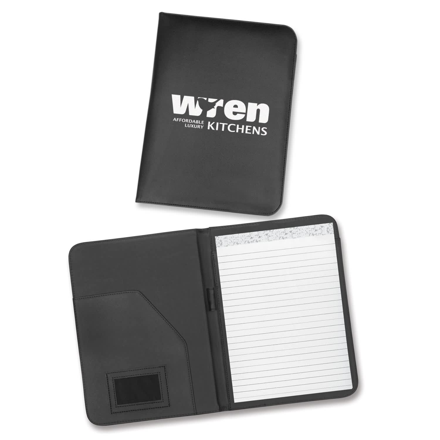 Large PU portfolio with a lined A4 pad and a pen loop. It laser engraves to a matt brown finish.