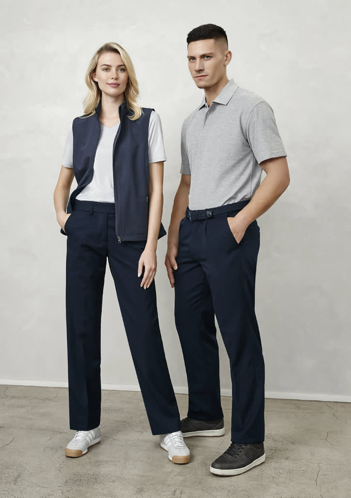 Features: Single pleat front with double hip back pockets and fob pocket Ready-to-wear with finished hem Biz Flexiband - allows the waistband to flex for the perfect fit and maximum comfort Fabric: 65% Polyester, 35% Viscose - Teflon® stain resistance fabric Sizes: 92S - 132S