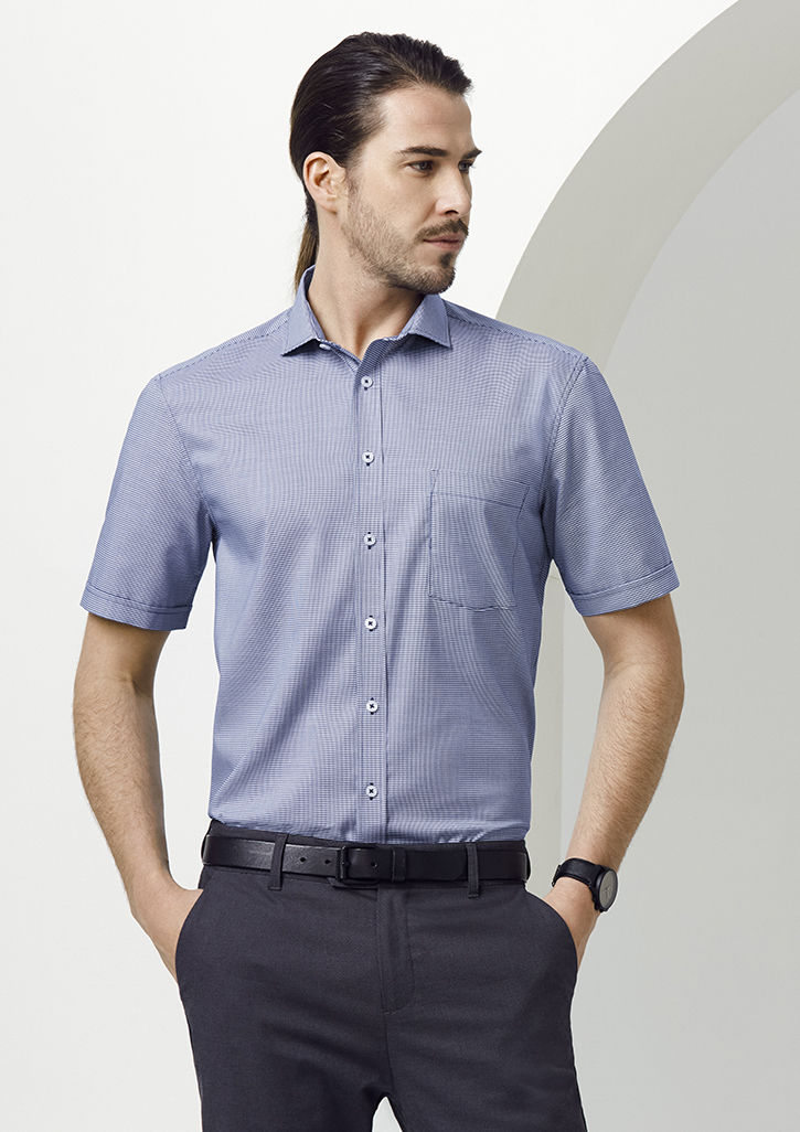 Advanced performance fabric finish for better wrinkle resistance. Mens features modern collar, chest pocket, twin back pleats. Can be worn tucked in or out