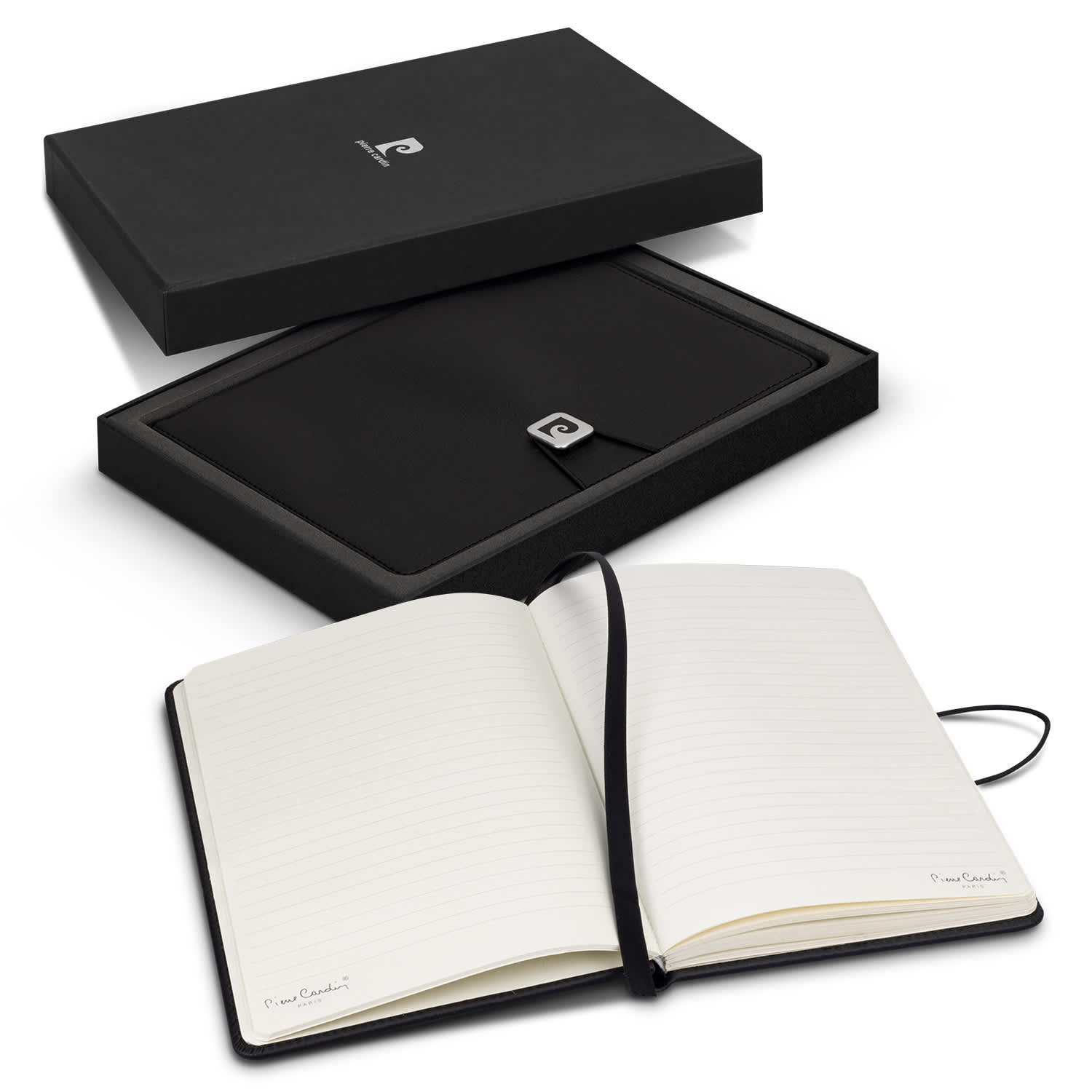 Quality medium-size (approximately A5) notebook presented in a stylish giftbox. The notebook that has 80 leaves of cream lined 80gsm paper, with a thermo PU cover and an elastic band closure with a branded metal slider. Features: * 80 leaves of cream lined 80gsm paper. * Thermo PU cover with branded metal buckle. * Pierre Cardin logo is debossed on the back cover. * Presentation: Black gift box with Pierre Cardin branding