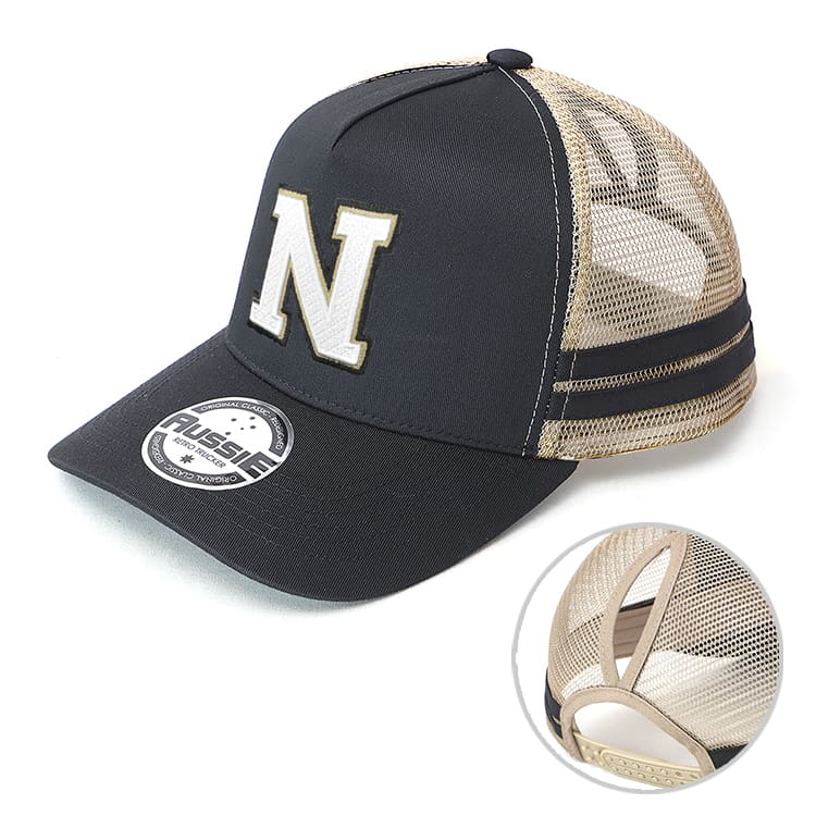 Structured 5-panel A-Frame design Two stripes on both sides Removable sticker on the peak Ponytail hole at the back