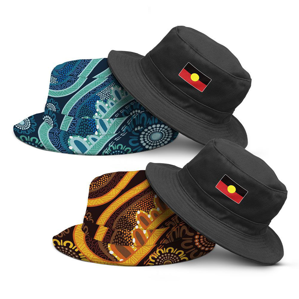 A premium (Reversible) bucket hat that features our exclusive "Healing Journey" design available in Coastal Blue or Brown Earth colour options on one side - and when reverse is a plain and sleek black with the Australian Aboriginal Flag placed on the front.