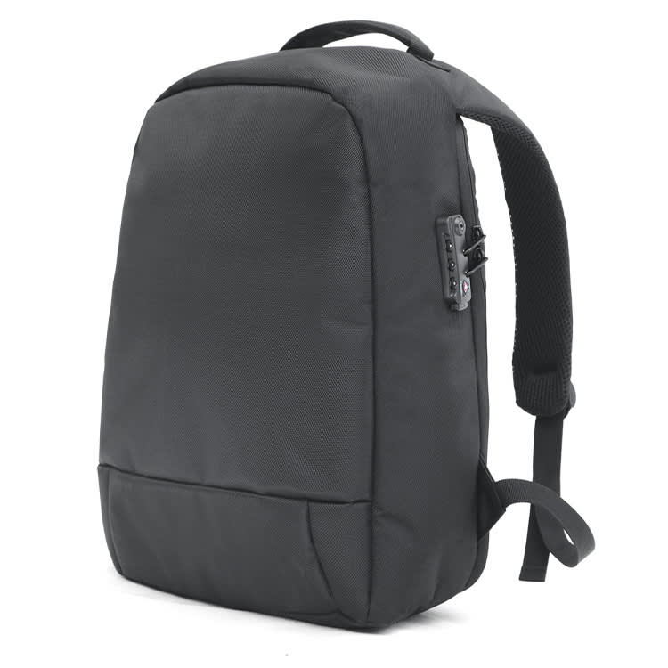 Main compartment with zip closure from the backside 3 digit combination lock and a connector for USB port Inside organiser and padded laptop holder Back zipper pocket and business card holder on luggage strap Adjustable padded backpack strap and reinforced carry handle