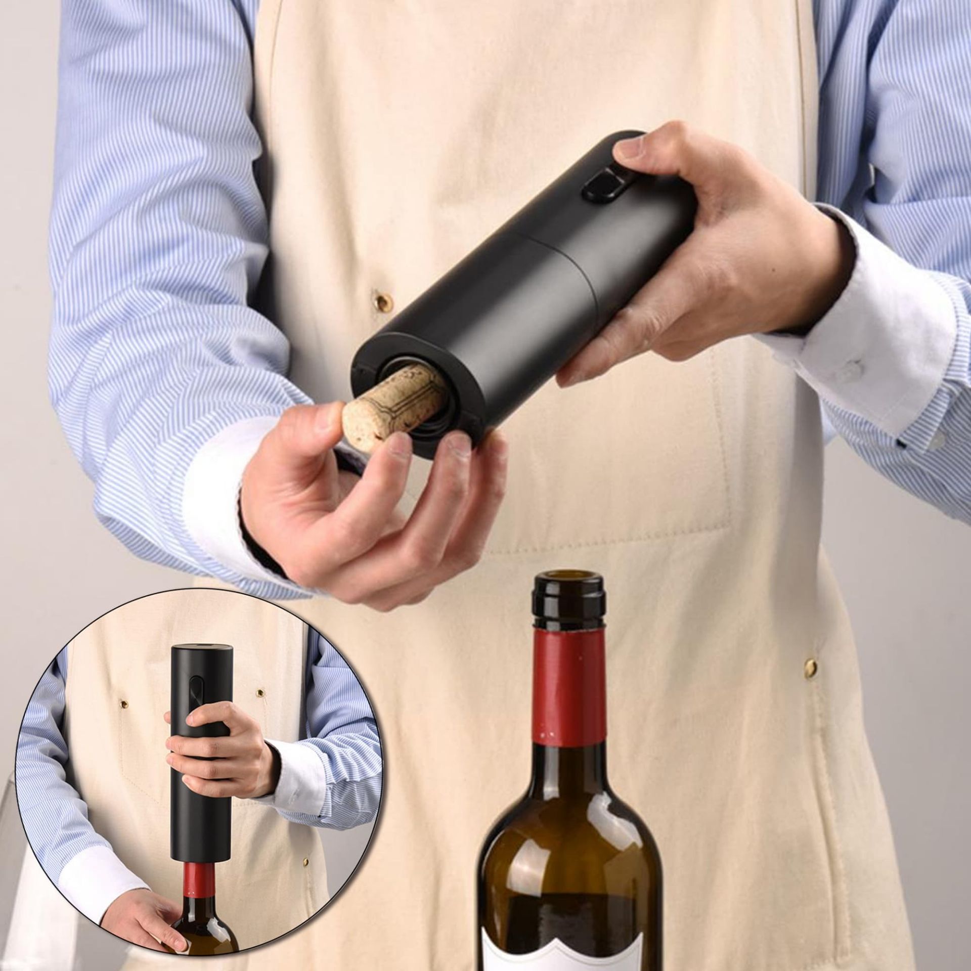 Automatic battery operated corkscrew wine bottle opener in a sleek black ASB plastic. It is a simple one touch operation that removes corks quickly and effortlessly without cork damage. Instructions included. Requires 4x AAA batteries which are not included.
