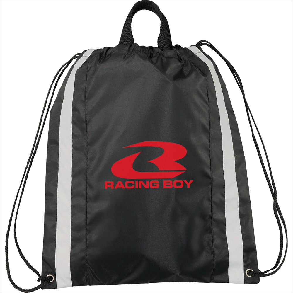 The Small Reflective Drawstring Bag has an open main compartment with a cinching rope closure and cool reflective stripes.