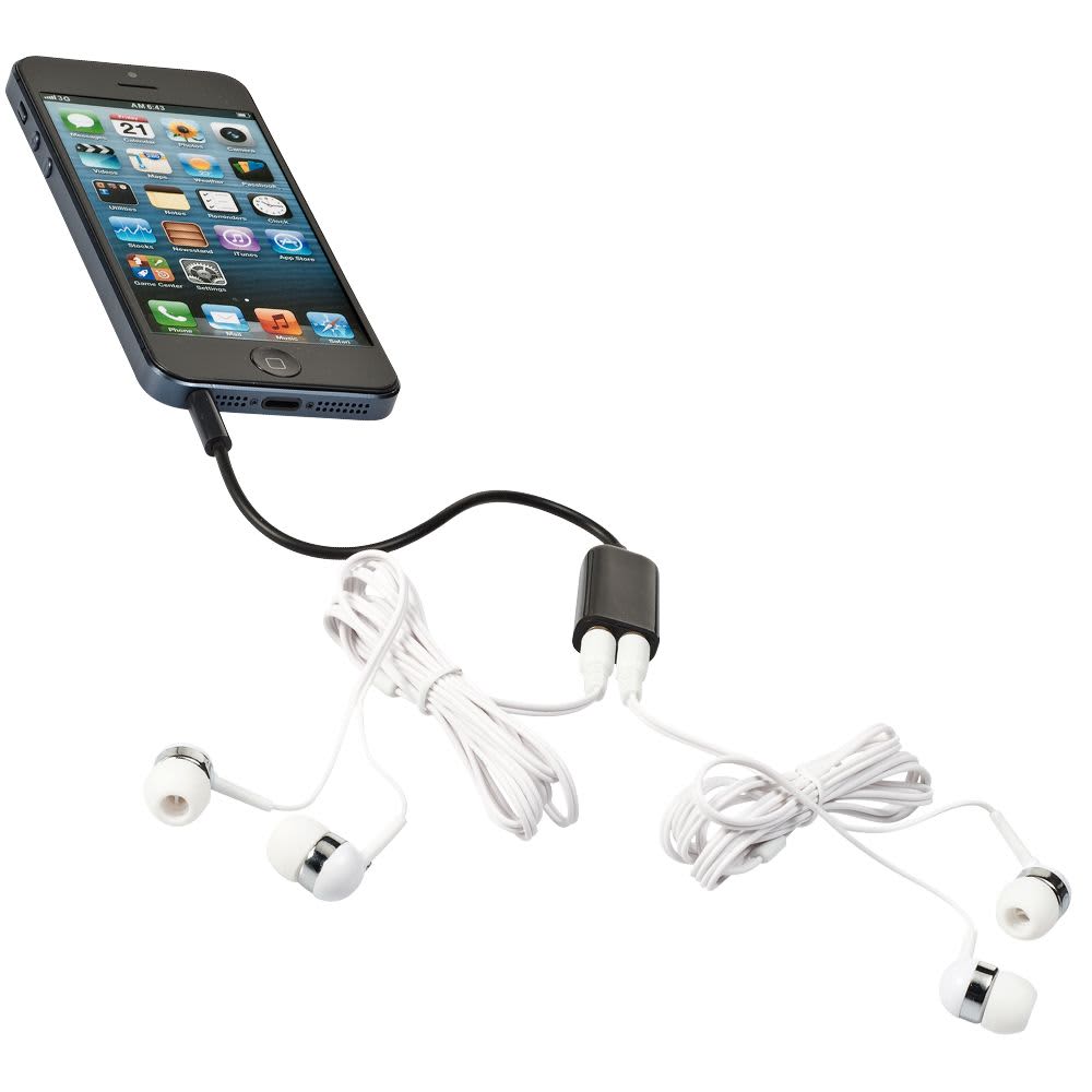 Sound off earbuds & splitter with case. This is the perfect travel accessory! This kit includes two sets of earbuds, a music splitter and EVA case. Allows two people to listen to the same audio device at the same time with their own set of earbuds. Can be used on smartphones, tablets and all music players with a 3,5 mm audio jack. Cable length: 110 mm. ABS plastic and EVA case.