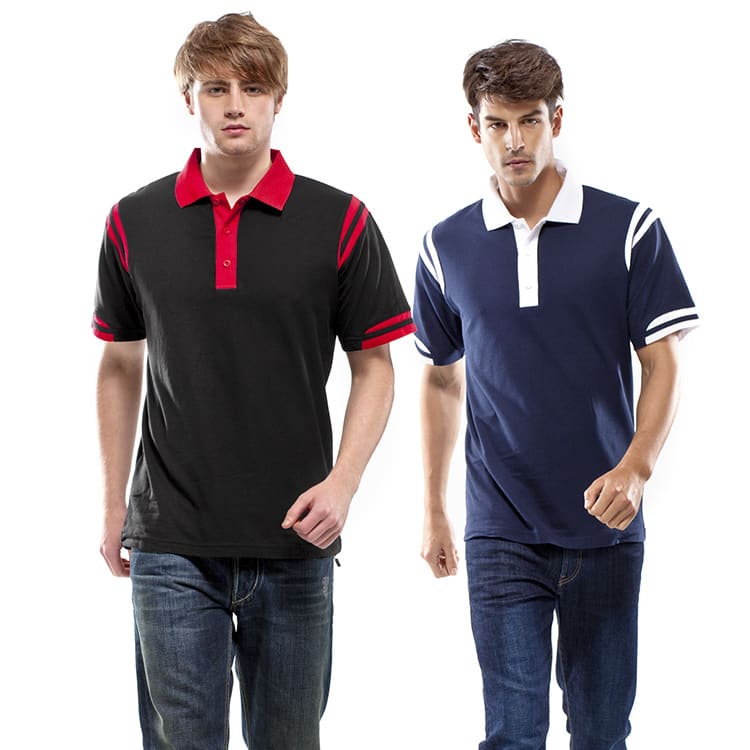 Cool dry double pique knit in 60% Cotton / 40% Polyester, Contrast panel trim design on both shoulders and sleeves, Contrast placket, Ribbed style collar, 210 gsm