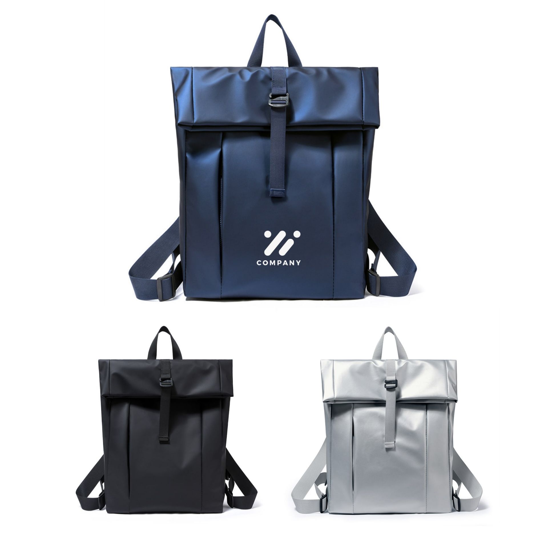 This stylish Tarpaulin Roll Top Backpack has a quality feel, with the capacity to fit up to your 15" laptops, featuring a front zipper pocket for essentials and a main pocket with a magnetic snap. Our fashion backpack is made of tarpaulin, that is water resistant and durable. With screen print to showcase your design, available 3 different colours.
