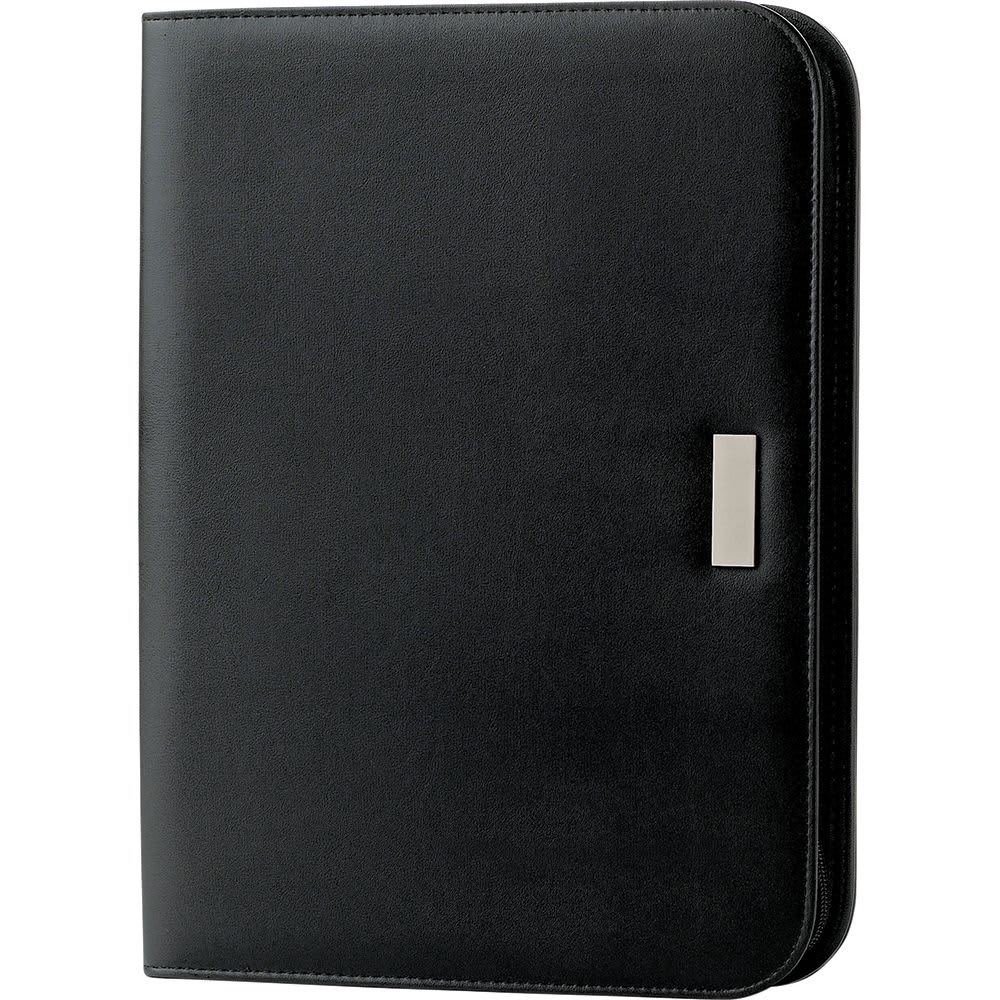 Stylish A4 compendium with solar calculator. Zippered closure. Includes refillable 30 page writing notepad. Front open document pocket. Internal expanding pocket, zippered pocket and pen loop. Pen not included.