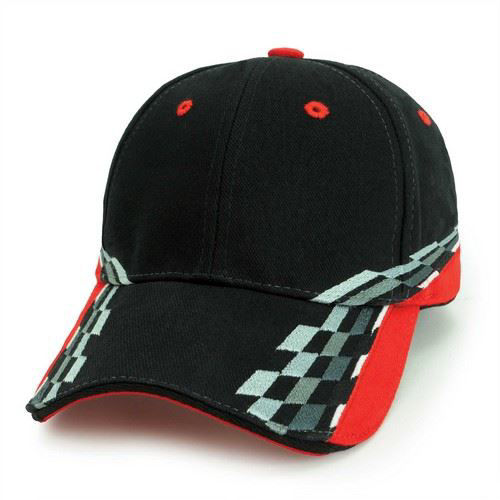 Structured 6-panel with pre-curved peak.Racing embroidery design with sandwich peak.