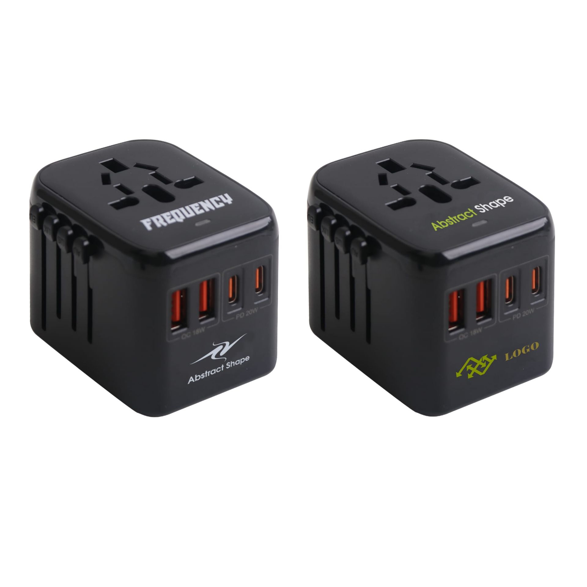 Get your brand seen while travelling overseas, with our Universal Travel Adapter with USB-C Ports. Made from PC material. Complete with screen print or UV print to showcase your design. Customized patterns can enhance the effect of brand promotion. Providing 2 USB A ports, 2 USB C ports, and 1 socket, it can power up to 5 devices at the same time. Our new adapter is a compact but high-speed adapter that provides dual PD 20W Type-C and dual QC 18W USB output. Compatible with AUS, US, UK, and EU outlets, covering more than 150 countries.