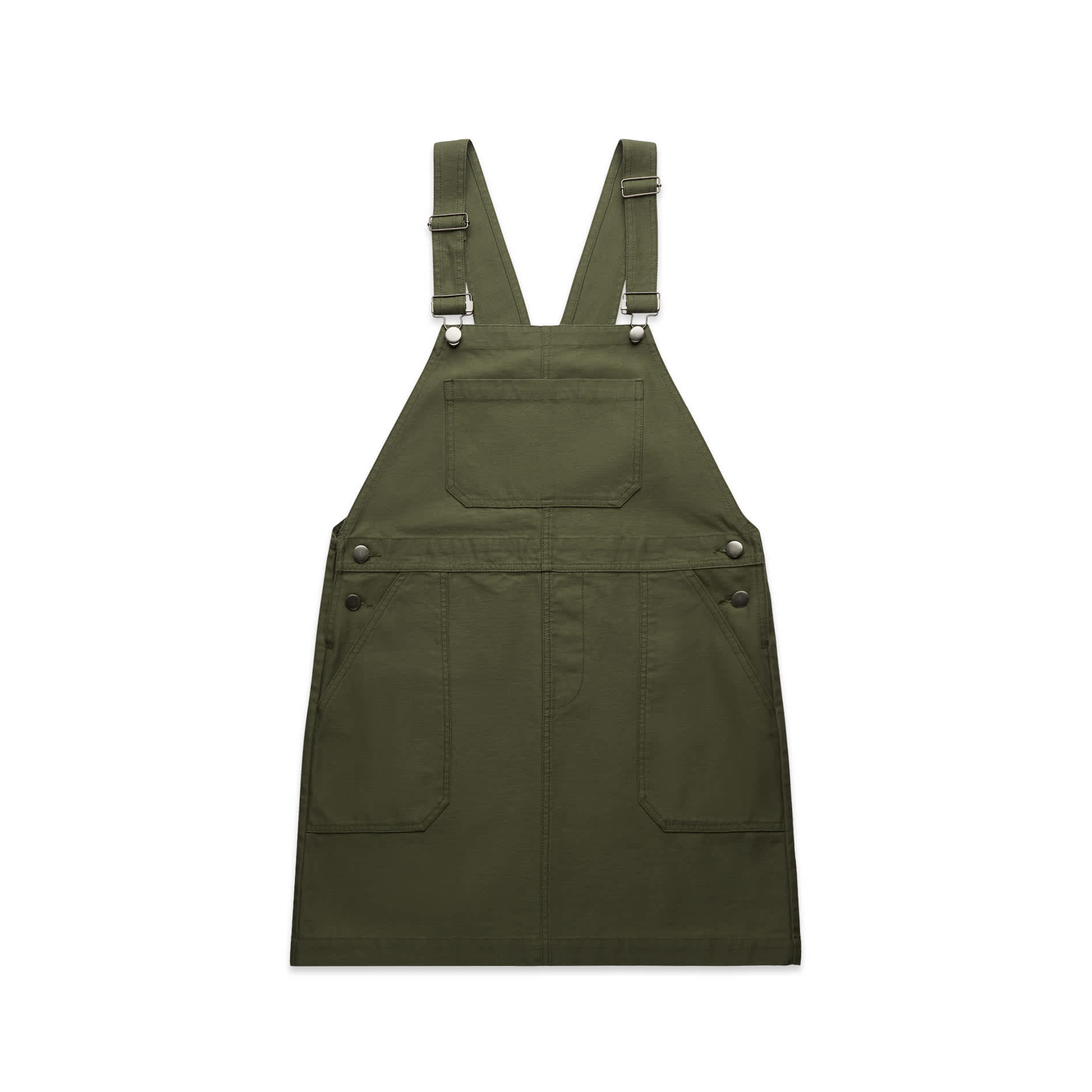 5 pockets, adjustable shoulder straps, black nickel hardware, shank buttons at sides, double stitched