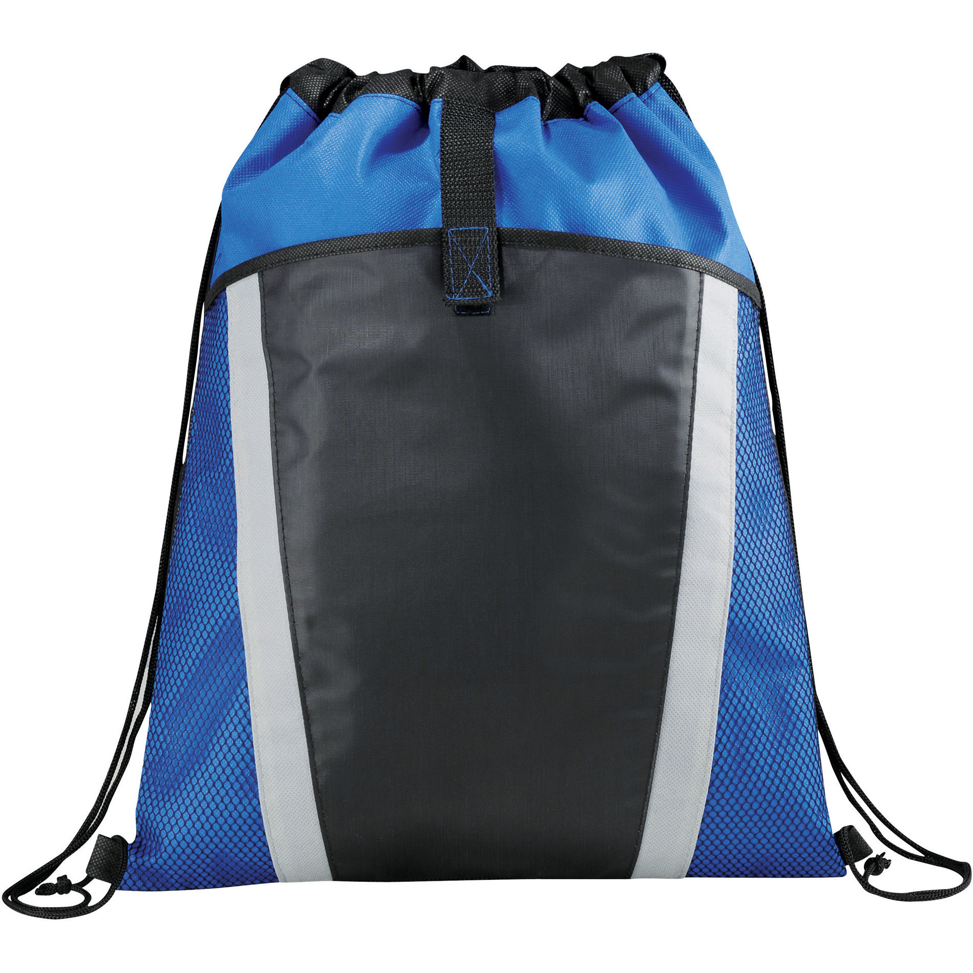 Large main compartment with drawstring rope closure. Open top front pocket with mesh accents and Velcro strap closure. Reinforced side tabs.