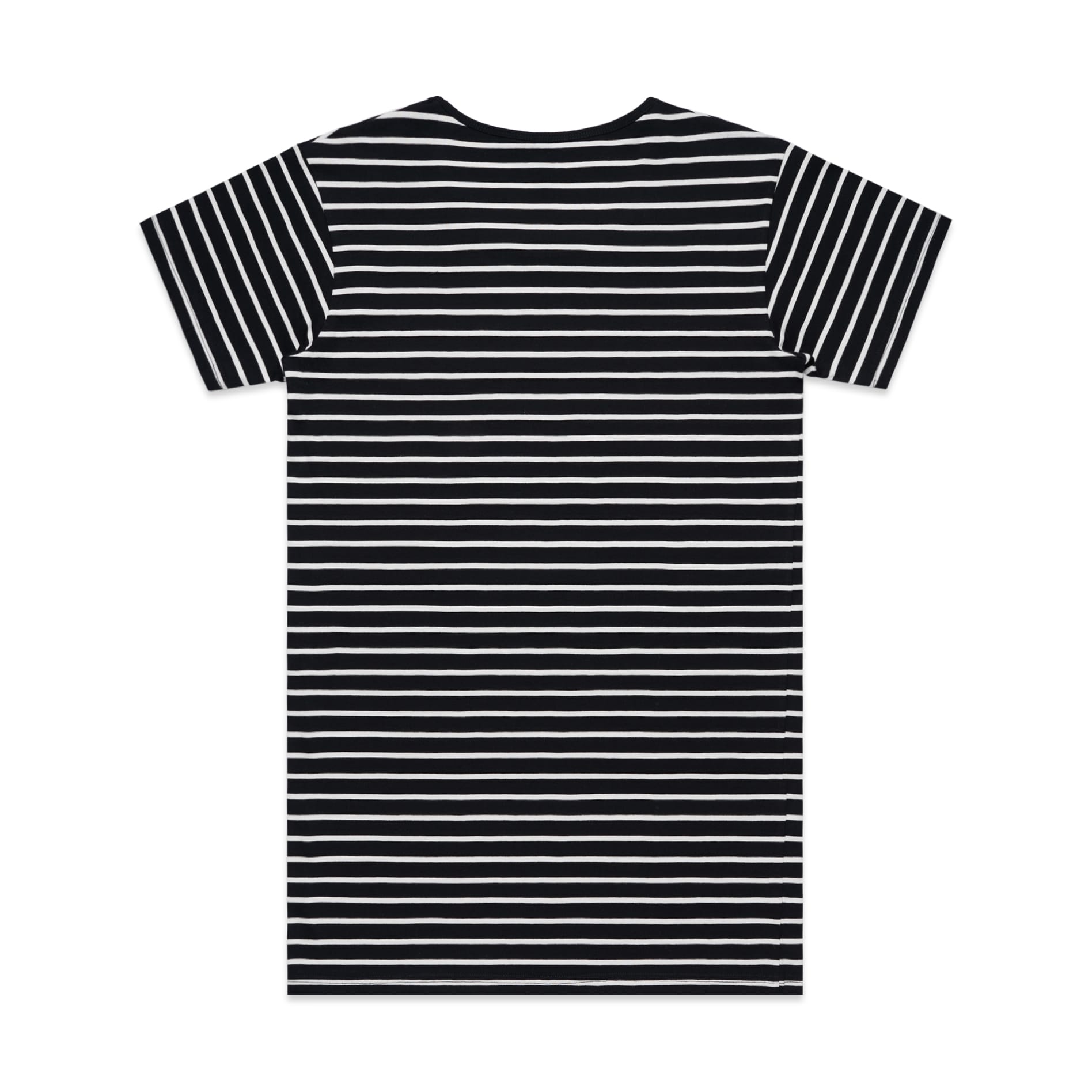 Regular-Relaxed fit Scoop neck, longer body, thin stripe Light weight, 150 GSM, 34-singles 100% combed cotton (marles 15% polyester) Self-fabric binding on neck, side seamed, double needle hems, preshrunk to minimise shrinkage