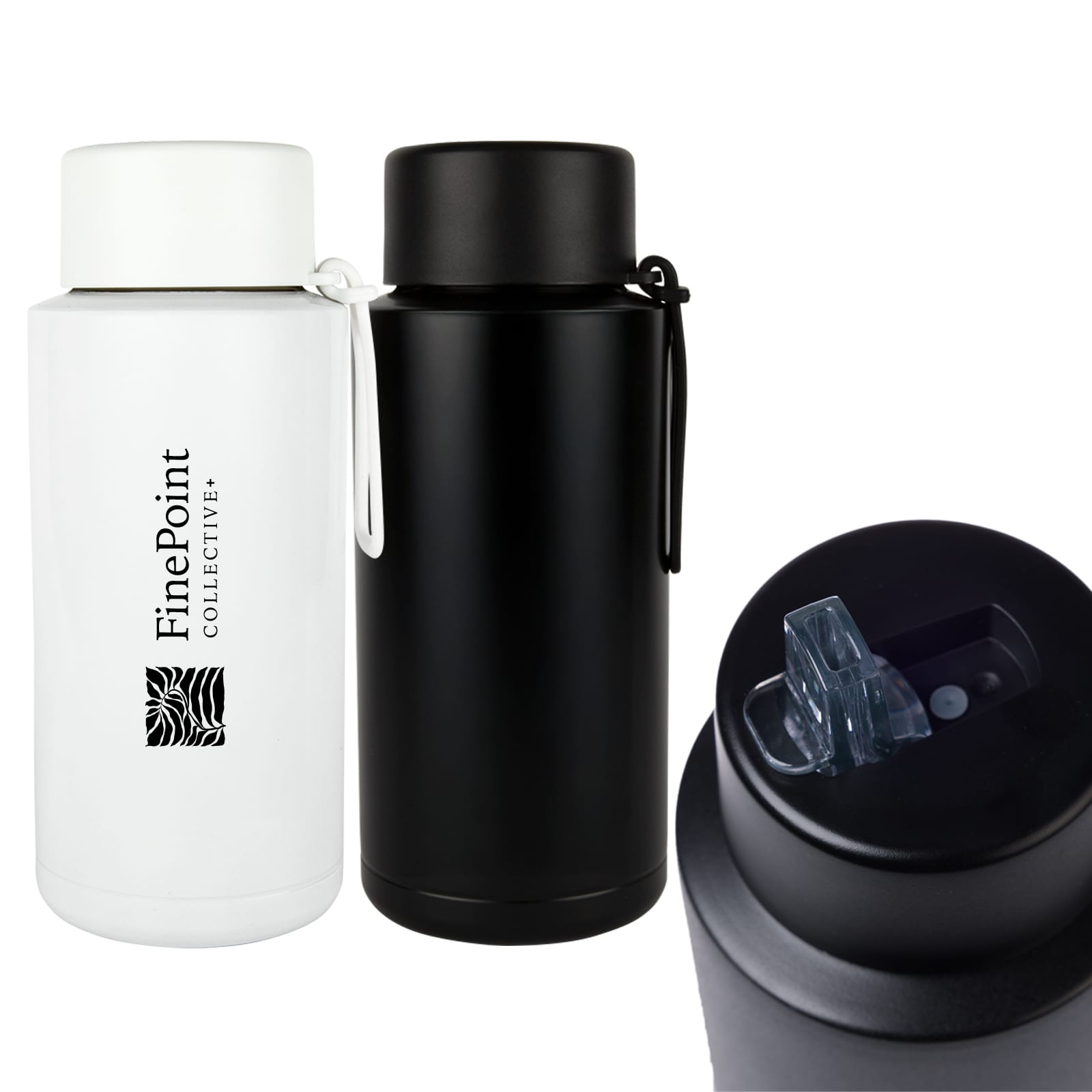The Zara 1L Stainless Steel Bottle, your ideal choice for staying hydrated throughout the day. This large capacity bottle features double wall stainless steel construction, ensuring your beverages stay at the perfect temperature for longer. It comes with a screw-on PP sip lid, a stainless steel straw, and a clear flip-up mouthpiece for easy drinking. Each lid is equipped with a matching silicone carry strap for convenient portability. Available in stylish Matte Black or Gloss White, the bottle is presented in a craft tuck box. Its durable design and large size mean fewer refills and more convenience.